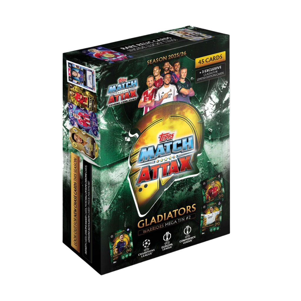 The Topps UCC Match Attax Mega Tin contains 45 Match Attax cards plus 3 exclusive Gladiators LE cards.